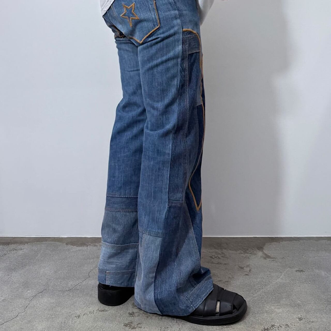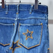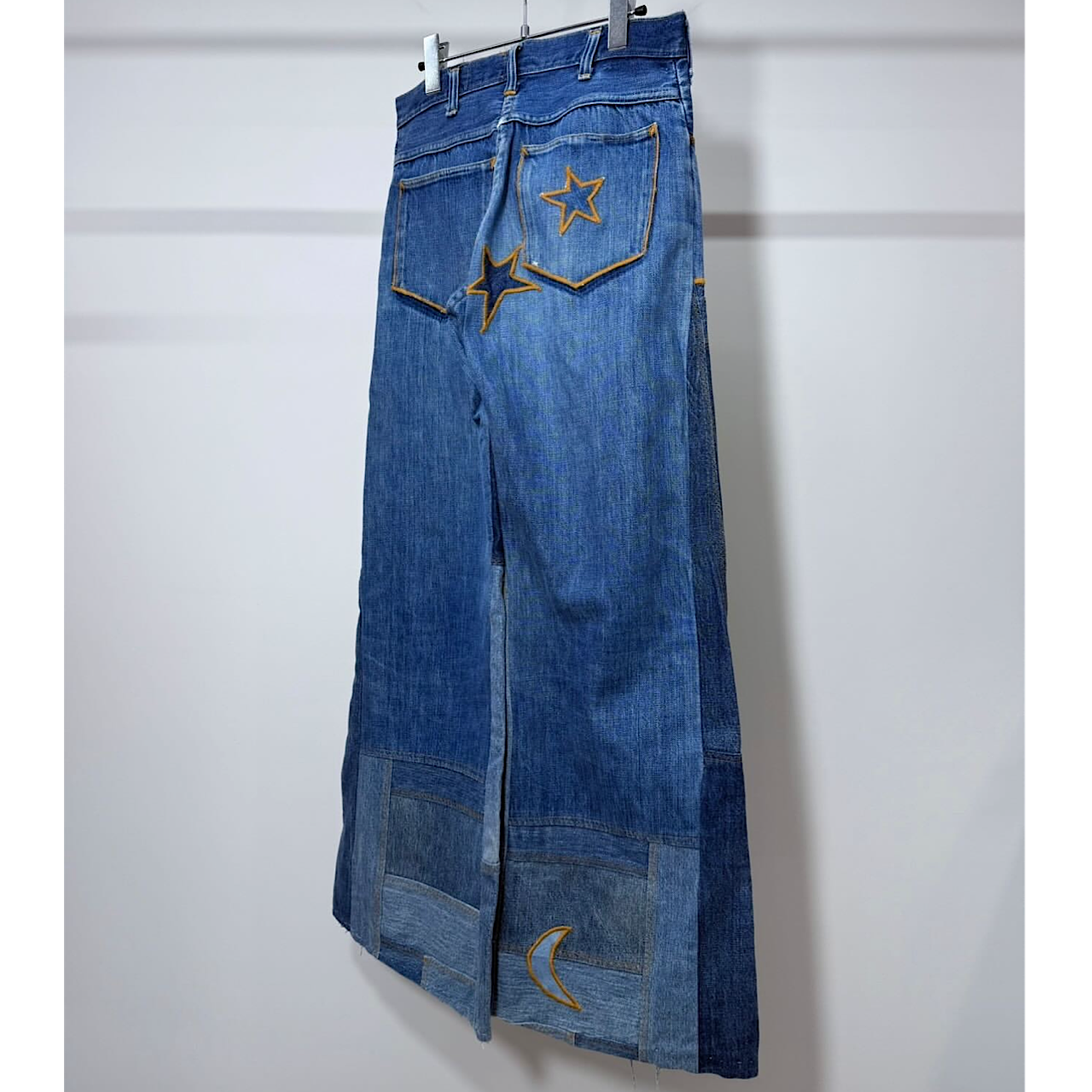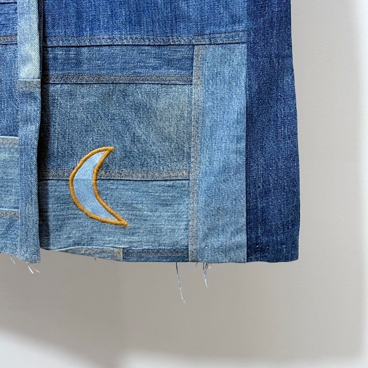 生地を縫い合わせて星や月などのパッチが付いていて全体的なステッチの色も統一されているのでガチャガチャしすぎない良いリメイクのバランスなのも良いです。